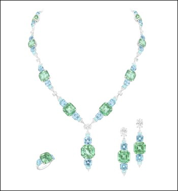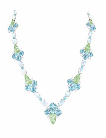 This set features a beautiful collection of pear-shaped mint tourmalines of 53 carats and cushion-shaped aquamarines of 87 carats, set together to create this flower shape. The semi-precious stones are then linked with moonstone cabochons and round paraibas. 18 Karat white gold. 'Lirya' Tourmaline, Aquamarine and Paraiba Set