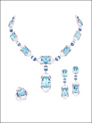 This set features a beautiful collection of cushion-shaped aquamarines of 180 carats, with no indication of therma treatment. Each stone is embraced by moonstone cabochons and small red spinels. The semi-precious stones are then linked with assher-cut diamonds of 15 carats and oval sapphires and 26 carats. 18 Karat white gold. 'Lirya' Morganite, Aquamarine, Sapphire and Diamond Set