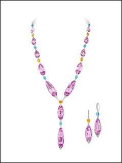 'Lirya' Kunzite, Pink Sapphire and Coloured Gemstone Necklace and Earrings This set features a beautiful collection of fancy-shaped kunzites of 346 carats embraced by fancy-shaped pink sapphires of 17 carats. The semi-precious stones are then linked with oval spessartite garnets and blue topaz.