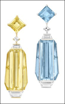 18 Karat white gold. 'Lirya' Diamond, Aquamarine and Yellow Beryl Earrings