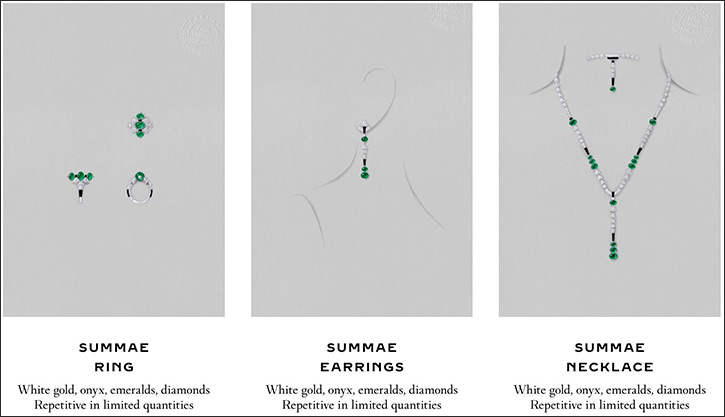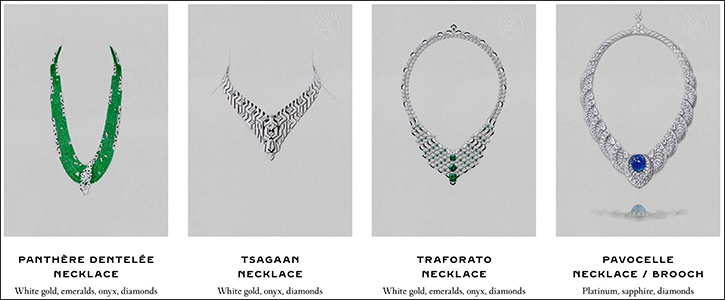 From simplicity to extravagance, through to subtle shades and bold chromatic harmonies, balancing symmetry and asymmetry: harmony is also born from the exploration and reconciliation of opposing forces. This singular vision is a balancing act, a tightrope that defines the Maison’s creative approach. SHITO This necklace was created from two 49.37-carat \ambian emerald drops, selected for the harmony of their volume and the elegance of this material. Suspended in asymmetrical pendants, they are the beginning and end of a line of emeralds and diamonds. Two pure curves delicately joined by an X of diamonds and, on the back, by an adjustable clasp set with diamonds. The refinement of the whole piece rests on the precision of the lines: that “nothing in excess” that says it all. HAYALA For this necklace, the delicate workmanship of the rose gold gives the impression that the stones are set directly onto the neck. In an effect of transparency that is as surprising as it is mysterious, a pear-shaped diamond sparkles below the 5.71-carat oval-cut diamond set in a pendant. The ultimate sophistication of this necklace, with a finesse reminiscent of a spider’s web, reflects the expertise of the Maison’s jewellery craftsmen. Panthère orbitale From the tips of its ears to its emerald eyes, the animal is sculpted with a coat of diamonds and onyx, exuding realism and vitality. Coral blends with amethyst in a harmony that flows from the cabochon in the centre to the smallest beads around the neck. The amethyst reveals its colour density through the fullness of its volumes. Panthère dentelée Then there are the stones: emeralds from Colombia, transformed into a cascade of faceted beads of different sizes and weights. From its intense colours to the impression of fluidity and its supple drape, everything comes to life thanks to the threading technique, which requires respect for the design, the curves and the layering. The iridescent material intensifies the light through the facets of each stone. Their uniqueness has a lifelike beauty. Tsaga AN This necklace captures the essence of the animal: rare, elusive and moving. The design is clean and restricted to only the essential. With a trompe-l’œil effect, the interplay of lines makes the feline’s head appear or disappear depending on the angle from which it is viewed. The styling is based on the interwoven geometric motifs set with kite-, lozenge- and triangle-cut diamonds and enhanced with onyx, in one of Cartier’s signature chromatic duos. The alternation of full and empty spaces creates an impression of movement with a sense of mystery. Trafo Rato Three octagonal Colombian emeralds of different weights and positions form the central axis of a geometric mesh. Touches of emerald and onyx here and there enhance the relief and add rhythm, creating an optical effect and an impression of movement. Openwork enhances the palette: a combination of three of Cartier’s signature colours, black, white and green. Pavo Celle The entire structure of this set transposes the volume of the central stone into a succession of openwork motifs, reminiscent of the peacock’s tail and its beauty. With lightness and movement, like diamond-set lace this creation seems to come to life before our eyes. In keeping with the Maison’s tradition of transformable jewellery, the centre stone and its support can be transformed into a collar brooch. The pear-shaped diamond in the clasp can then be added as a pendant.