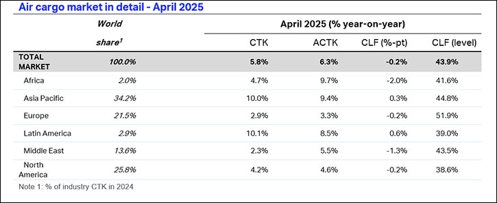 29 May 2025 (Geneva) - The International Air Transport Association (IATA) released data for April 2025 global air cargo markets showing: - Total demand, measured in cargo tonne-kilometers (CTK), rose by 5.8% compared to April 2024 levels (+6.5% for international operations).