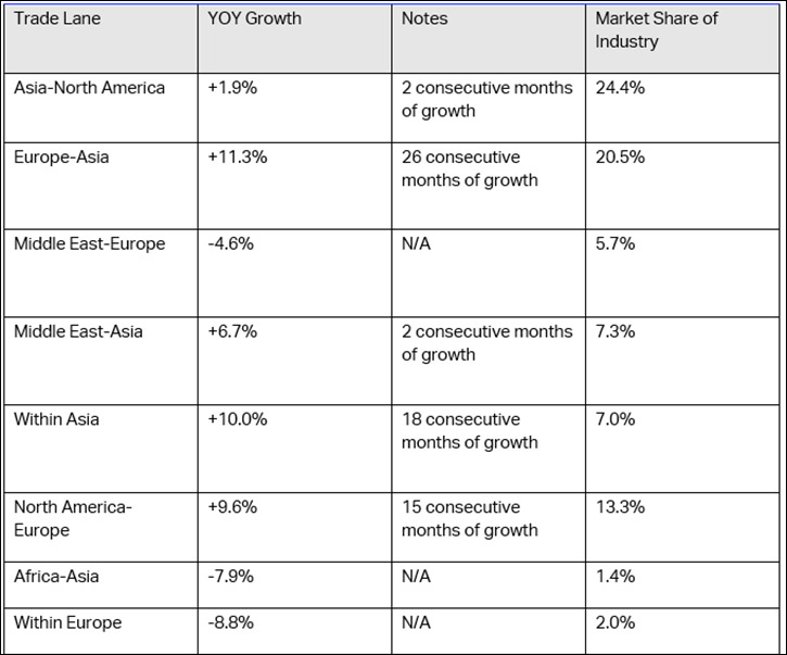 April Regional Performance Asia-Pacific airlines saw 10.0% year-on-year demand growth for air cargo in April. Capacity increased by 9.4% year-on-year. North American carriers saw 4.2% year-on-year demand growth for air cargo in April. Capacity increased by 4.6% year-on-year. European carriers saw 2.9% year-on-year demand growth for air cargo in April. Capacity increased 3.3% year-on-year. Middle Eastern carriers saw 2.3% year-on-year increase in demand for air cargo in April, the slowest among the regions. Capacity increased by 5.5% year-on-year. Latin American carriers saw a 10.1% year-on-year increase in demand growth for air cargo in April, the strongest growth among the regions. Capacity increased 8.5% year-on-year. African airlines saw a 4.7% year-on-year increase in demand for air cargo in April. Capacity increased by 9.7% year-on-year. Trade Lane Growth: All international routes experienced growth in April, except for Middle East-Europe, Africa-Asia, and intra-European route.