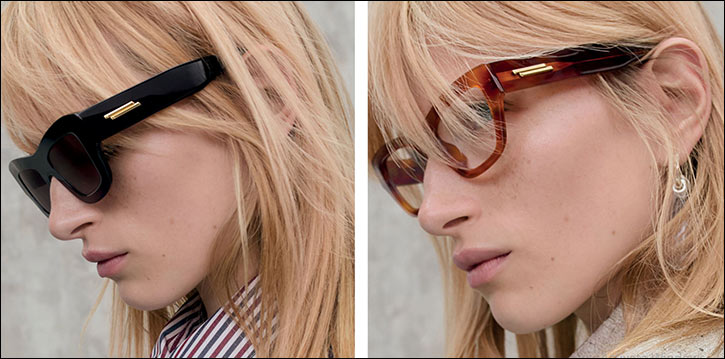 The new Bottega Veneta Eyewear Campaign features sunglasses and optical frames that balance discreet design with elevated embellishments. Each model merges form and function, evolving signature forms and motifs in a distinctive look and feel that embodies the House's commitment to craft and creativity. Acetate frames are enhanced with Flat Ribbon details and finished with beveled effects and varying thicknesses. BV1357S Unisex squared frame featuring a thin acetate construction and bold bevelled profiles, embellished with a metal ribbon on the temples. BV1360O Soft cat-eye optical frame featuring a thin acetate construction, bevelled profiles, and the signature metal ribbon on the temples