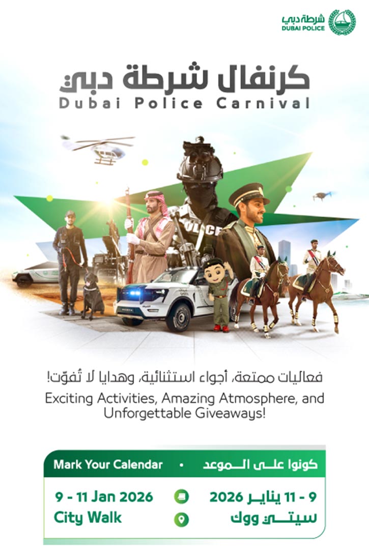 Discover Services That Matter Visitors can explore a wide range of police and community services, including the Dubai Police smart app, volunteering opportunities through the national volunteering platform, home security services, cybercrime awareness through the e-Crime Hub, reporting services via Police Eye, lost and found services, enquiries on alerts and travel bans, and the Aman Roads platform dedicated to road safety. The Dubai Police Museum will also welcome guests to discover the story of policing in Dubai, highlighting key milestones in security and technology over the years. Enjoy Live Shows and Interactive Experiences The carnival features motorcycle and bicycle performances, live music by the Dubai Police Academy band, police dog shows, luxury tourist patrol vehicles, and an immersive virtual reality experience inside the Ghiath patrol car. Visitors can also view heritage displays such as a classic Land Rover, the Ramadan cannon, and special exhibits from the UAE SWAT Challenge, including an armoured vehicle and diving suit. A Treat for Families and Children Children and families can enjoy creative workshops at the Makers Studio (Al Sunaa), interactive digital games, sports activities, puzzles, competitions, and gifts at the Khalid Children's Magazine platform. The Dubai Police Carnival offers a perfect opportunity to spend quality time with family, enjoy unique experiences, and get to know police services in a relaxed and engaging atmosphere at City Walk.